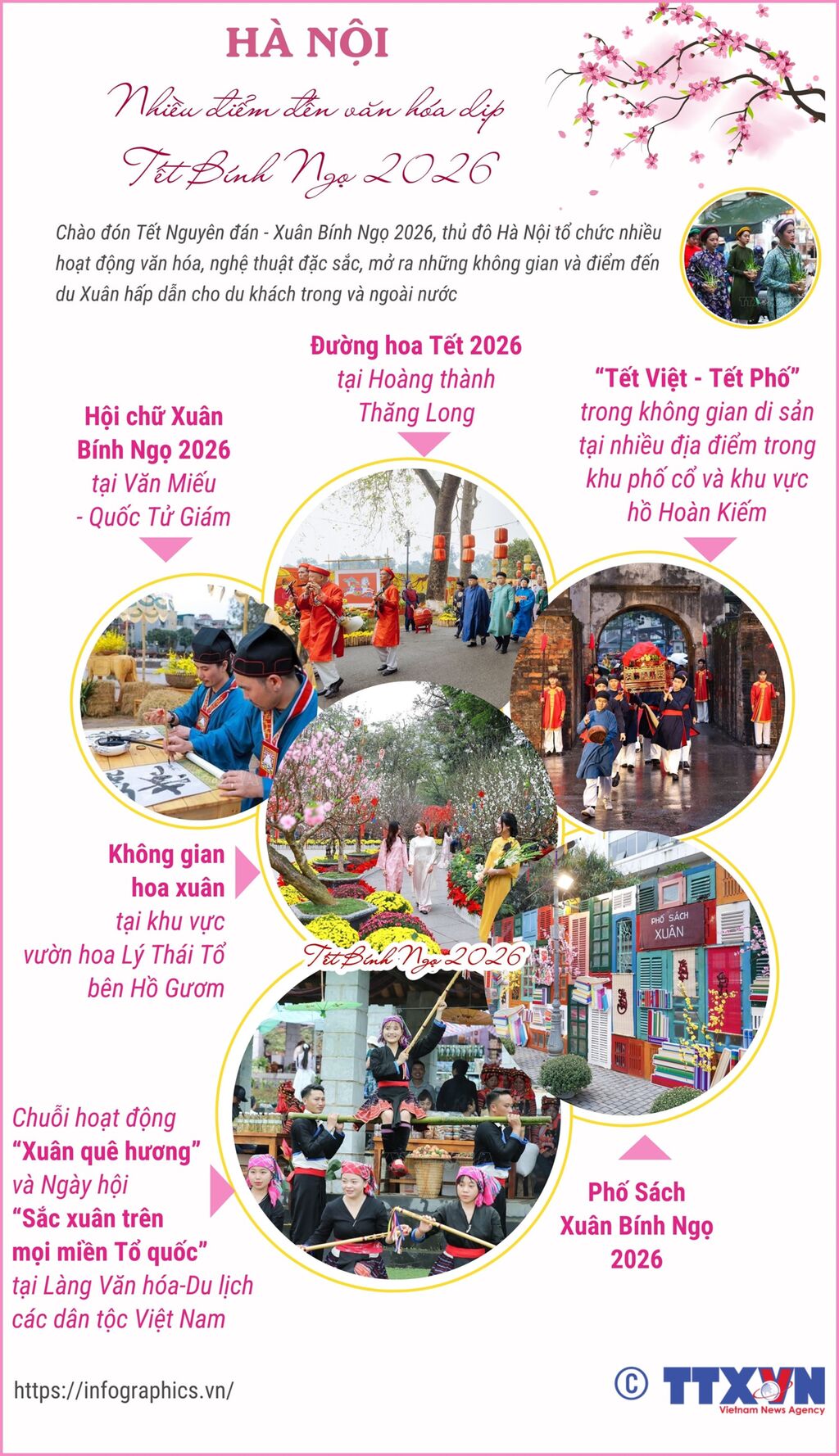 Chào đón Tết Nguyên đán - Xuân Bính Ngọ 2026, thủ đô Hà Nội tổ chức nhiều hoạt động văn hóa, nghệ thuật đặc sắc, mở ra những không gian và điểm đến du Xuân hấp dẫn cho du khách trong và ngoài nước.