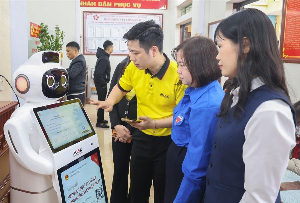 | Cán bộ Trung tâm phục vụ hành chính công xã Quỹ Nhất hướng dẫn người dân thao tác trên Robot Lễ tân AI. |