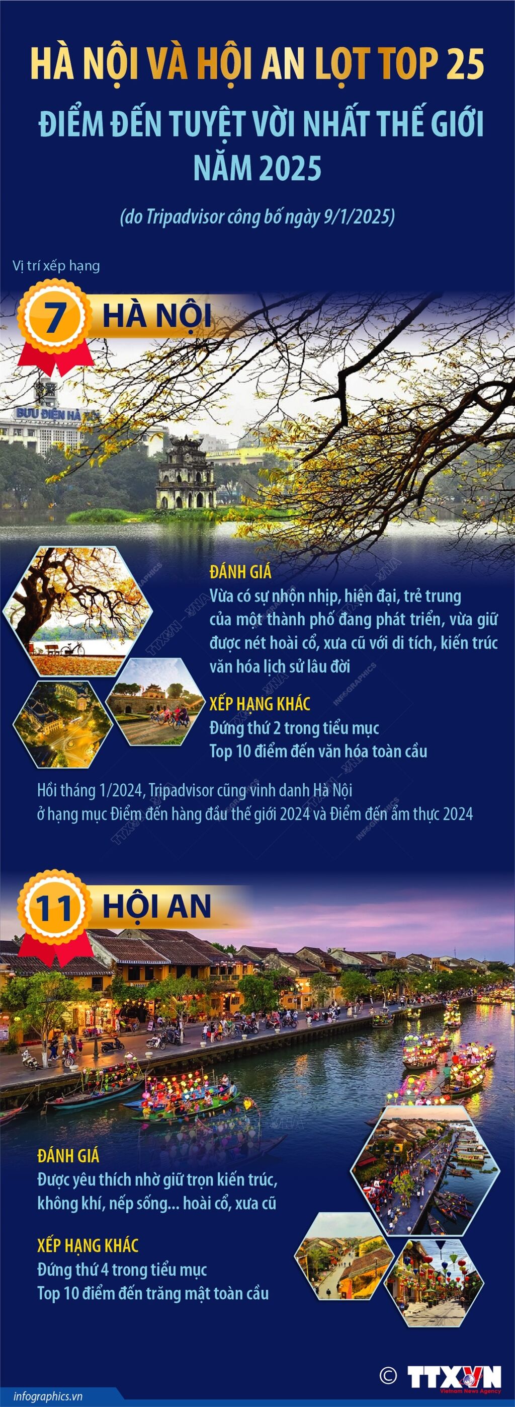 Tripadvisor ngày 9/1/2025 đã công bố top 25 điểm đến tuyệt vời nhất trên thế giới. Đây là những cái tên nằm trong hạng mục "Best of the Best" thuộc khuôn khổ giải thưởng Travelers' Choice Awards do chính người dùng trên nền tảng du lịch này bình chọn. Việt Nam có hai thành phố lọt vào danh sách là Hà Nội và Hội An.