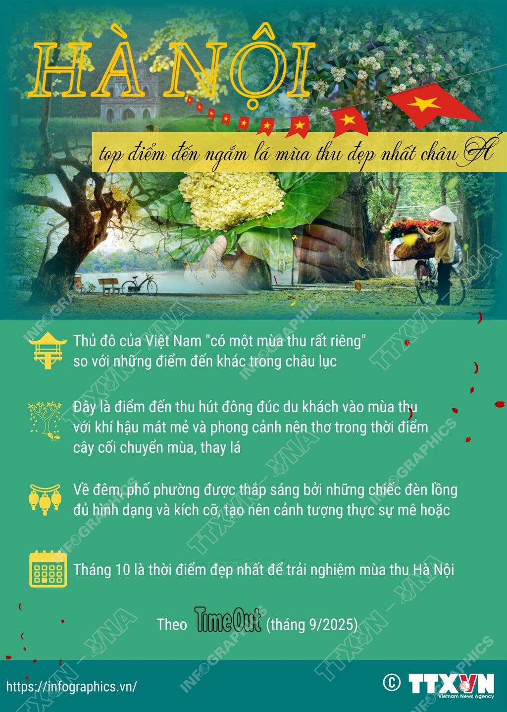 Tạp chí Time Out bình chọn Hà Nội là điểm đến lý tưởng để ngắm lá mùa thu, với sắc lá đỏ, vàng trong không khí se lạnh cùng trải nghiệm Tết Trung thu đa sắc ở phố cổ. Hà Nội xếp thứ 5 trong danh sách các điểm đến ngắm lá mùa thu đẹp nhất châu Á. Tạp chí Anh miêu tả thủ đô của Việt Nam "có một mùa thu rất riêng" so với những điểm đến khác trong châu lục.