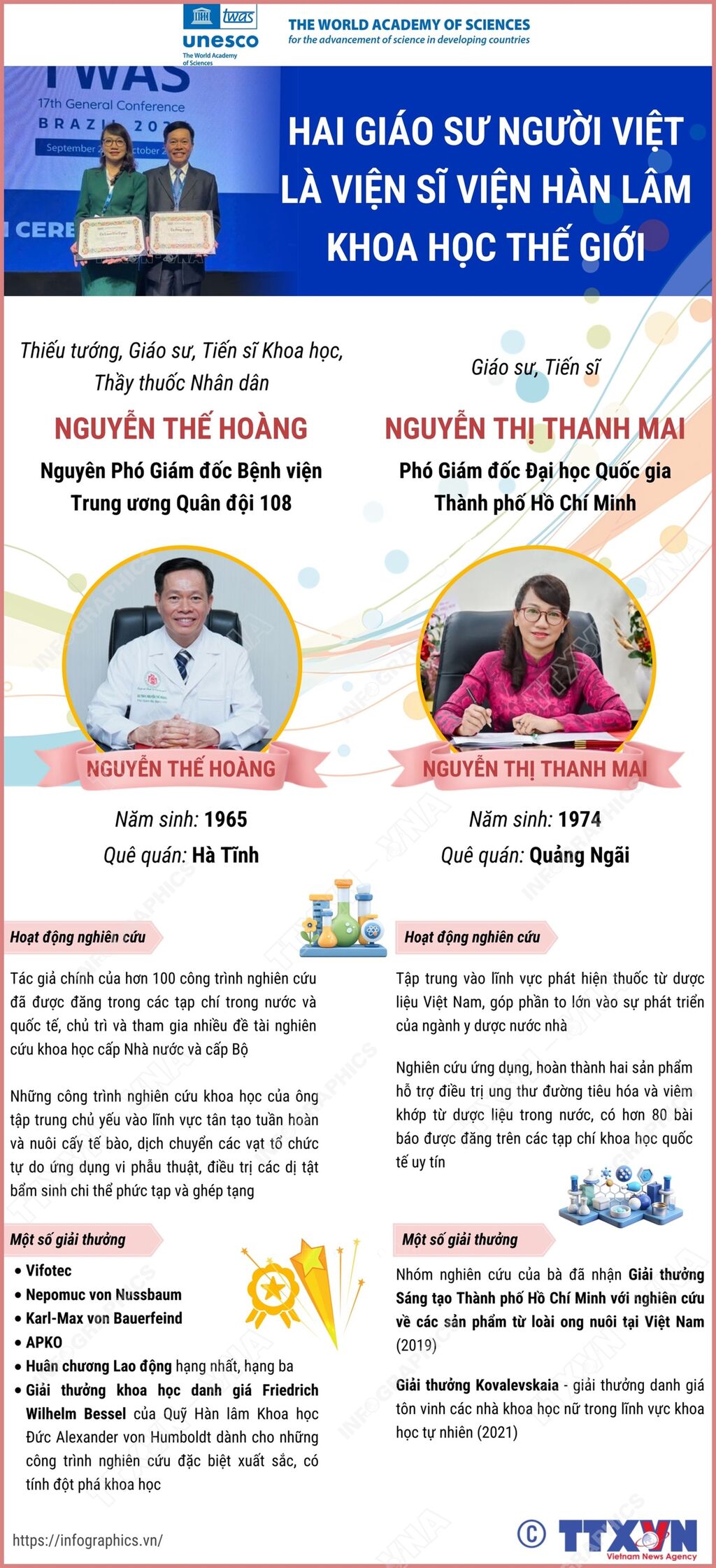 Tại Hội nghị TWAS lần thứ 17 diễn ra từ 29/9 đến 2/10/2025 tại Rio de Janeiro, Brazil, Thiếu tướng, Giáo sư, Tiến sĩ Khoa học, Thầy thuốc Nhân dân Nguyễn Thế Hoàng, nguyên Phó Giám đốc Bệnh viện Trung ương Quân đội 108 và Giáo sư, Tiến sĩ Nguyễn Thị Thanh Mai, Phó Giám đốc Đại học Quốc gia Thành phố Hồ Chí Minh đã vinh dự được Giáo sư, Tiến sĩ khoa học Quarraisha Abdool Karim, Chủ tịch Viện Hàn lâm Khoa học Thế giới (TWAS) trao bằng công nhận Viện sĩ chính thức của Viện Hàn lâm Khoa học Thế giới trước sự chứng kiến của hơn 300 đại biểu là các nhà khoa học từ khắp nơi trên thế giới.