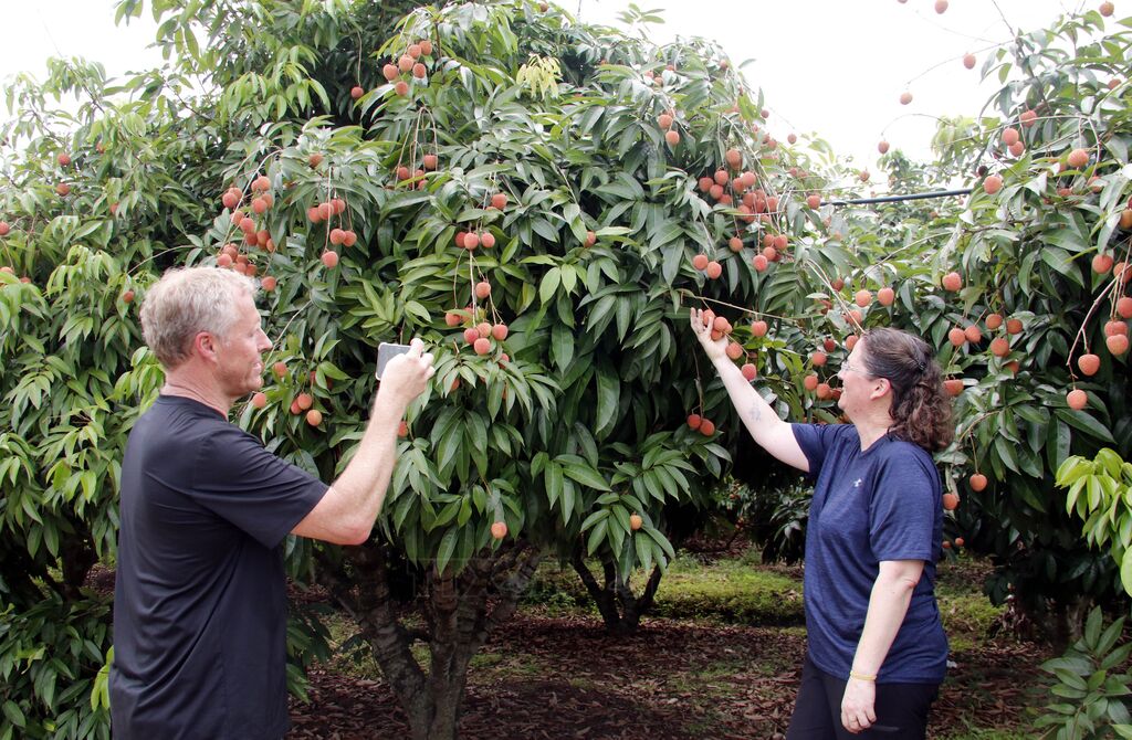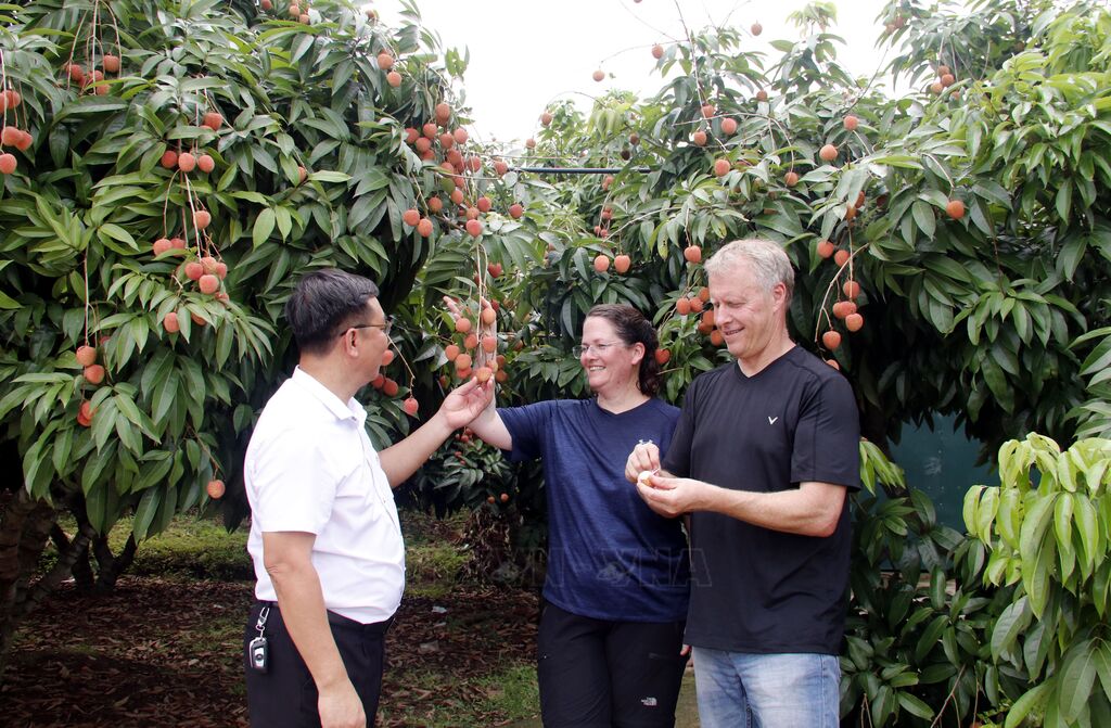 | Du khách tham quan và thưởng thức vải tại vườn. |