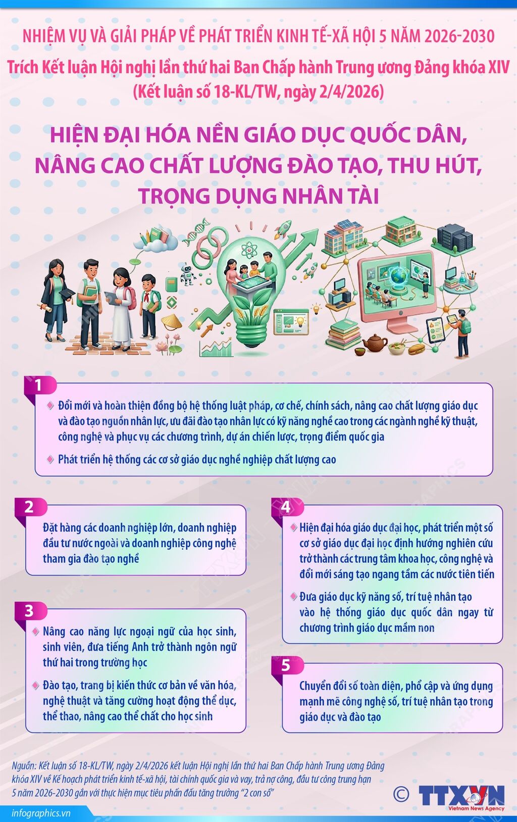 Hiện đại hóa nền giáo dục quốc dân, nâng cao chất lượng đào tạo, thu hút, trọng dụng nhân tài (trích Kết luận số 18-KL/TW, ngày 2/4/2026)