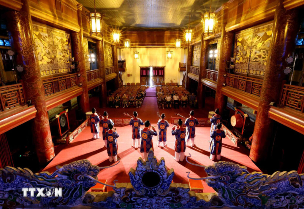 | Những thanh âm trầm bổng, uy nghi của dàn Đại nhạc vang lên tại nhà hát Duyệt Thị Đường, tái hiện không gian văn hóa cung đình một thuở. |