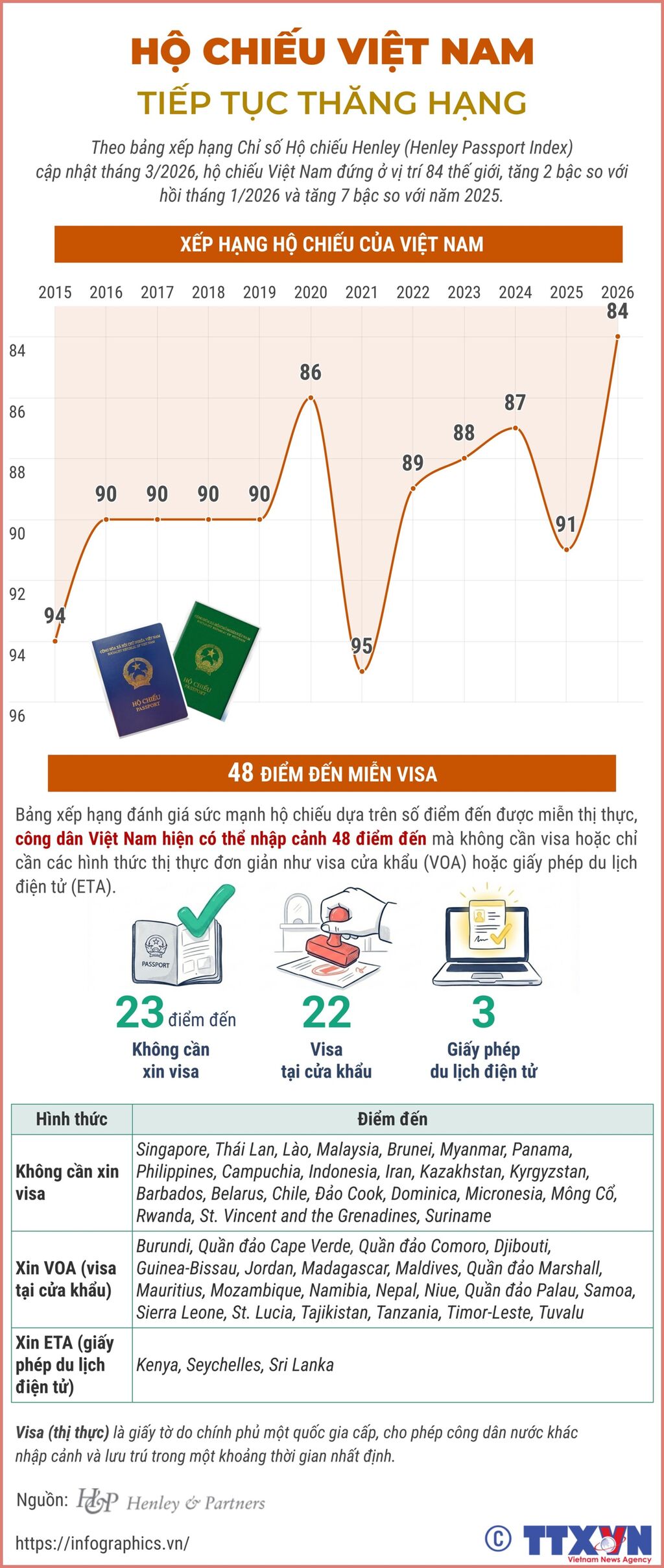 Theo bảng xếp hạng Chỉ số Hộ chiếu Henley (Henley Passport Index) cập nhật tháng 3/2026, hộ chiếu Việt Nam đứng ở vị trí 84 thế giới, tăng 2 bậc so với hồi tháng 1/2026 và tăng 7 bậc so với năm 2025.