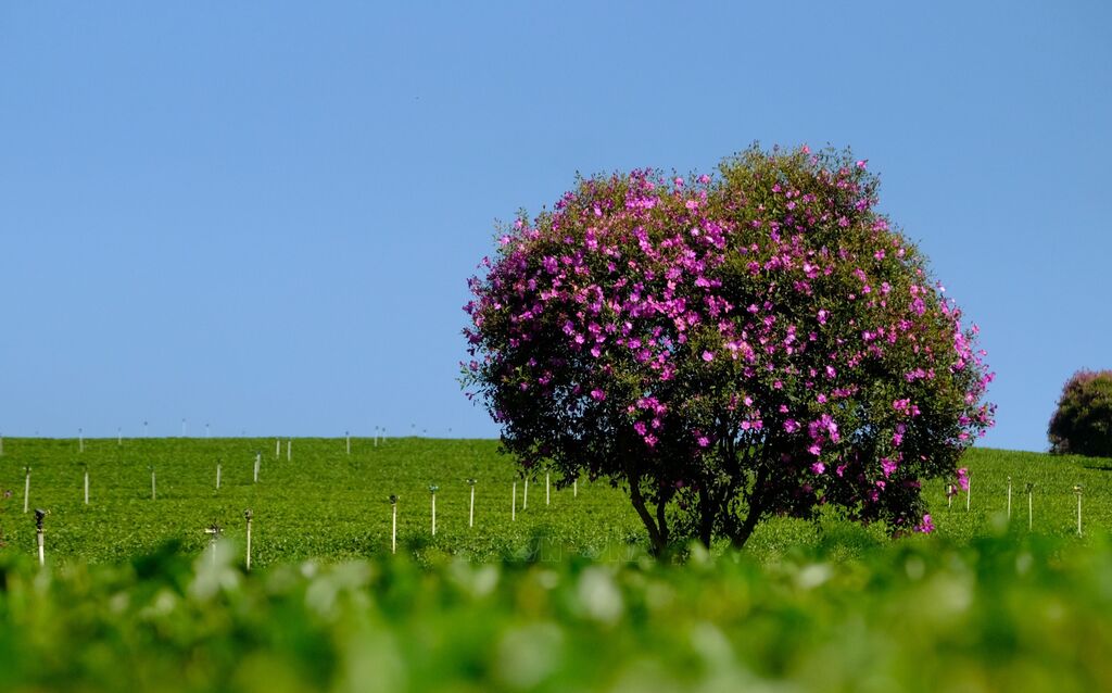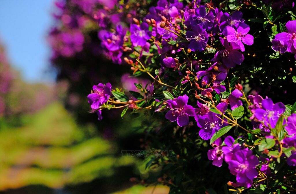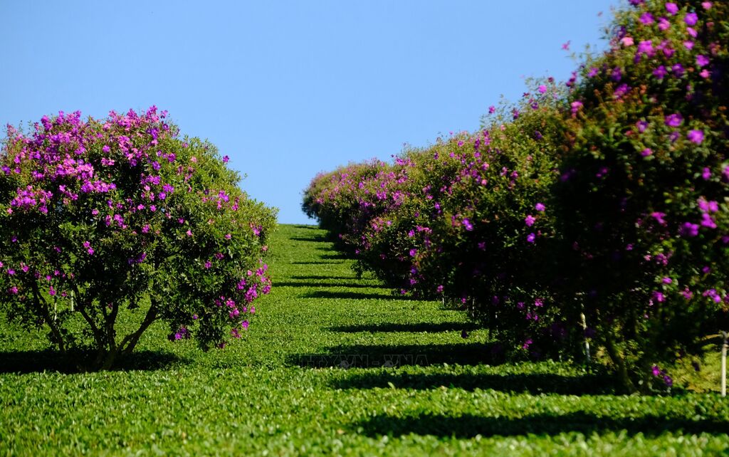 Những ngày cuối năm, hoa mua bung nở rực rỡ trên nhiều đồi chè ở thành phố Bảo Lộc và huyện Bảo Lâm (Lâm Đồng), thu hút đông đảo khách tham quan. Ảnh: Nguyễn Dũng – TTXVN