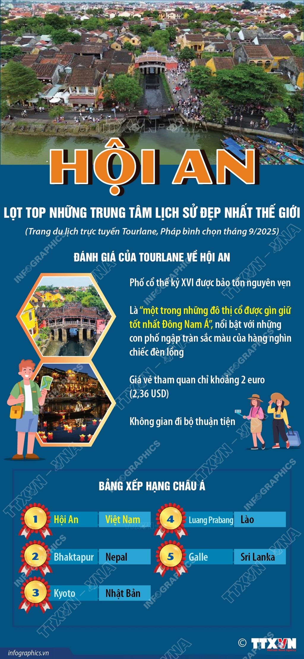 Phố cổ Hội An của Việt Nam vừa được trang du lịch trực tuyến Tourlane của Pháp xếp hạng là trung tâm lịch sử đẹp nhất châu Á, sánh ngang với những di sản nổi tiếng toàn cầu như Krakow (Ba Lan), Avignon (Pháp) hay Cartagena (Colombia).