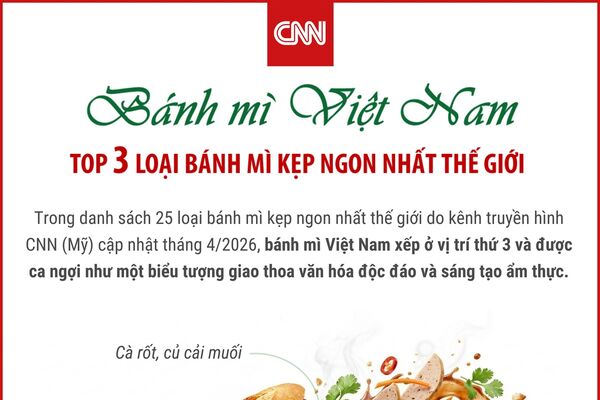 Trong danh sách 25 loại bánh mì kẹp ngon nhất thế giới do kênh truyền hình CNN (Mỹ) cập nhật tháng 4/2026, bánh mì Việt Nam xếp ở vị trí thứ 3 và được ca ngợi như một biểu tượng giao thoa văn hóa độc đáo và đầy sức hút.