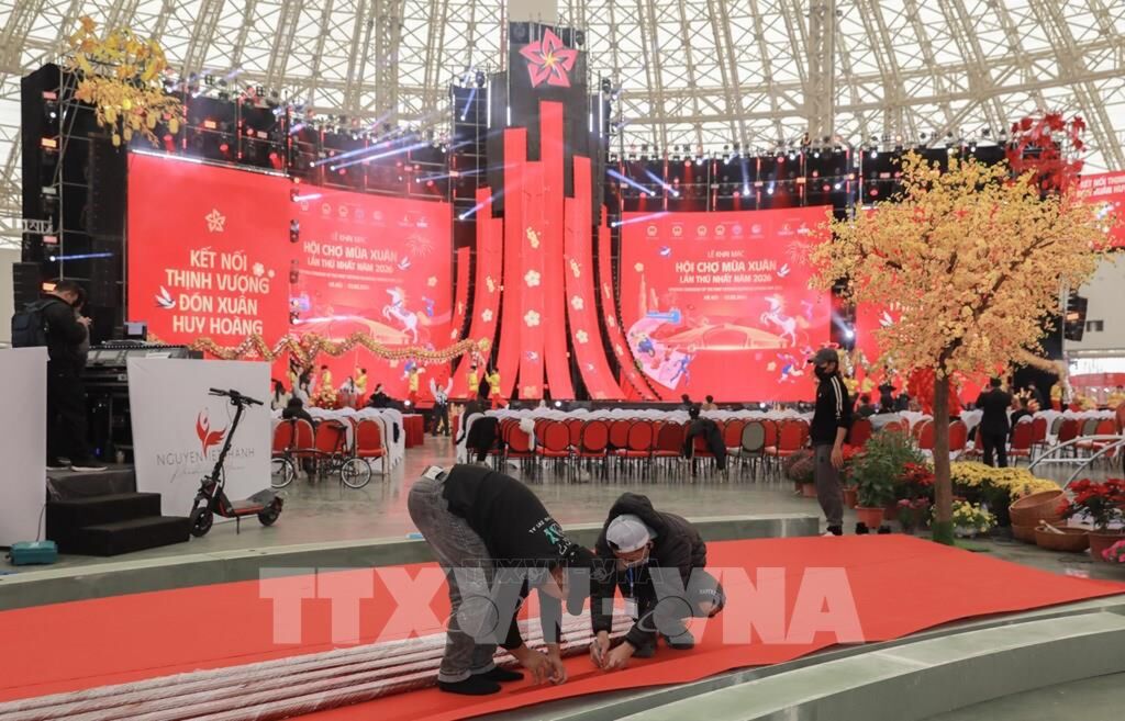 Tại khu vực trung tâm, nơi diễn ra hoạt động trưng bày, quảng bá và kết nối hệ thống khung gian hàng đã hoàn thành lắp đặt. Các hạng mục trang trí, điện chiếu sáng, âm thanh, sân khấu chính, khu vực check-in đang được hoàn thiện những khâu cuối cùng theo đúng thiết kế. Không gian hội chợ dần hiện rõ với sắc xuân chủ đạo, tạo diện mạo sinh động, sẵn sàng đón khách tham quan.
