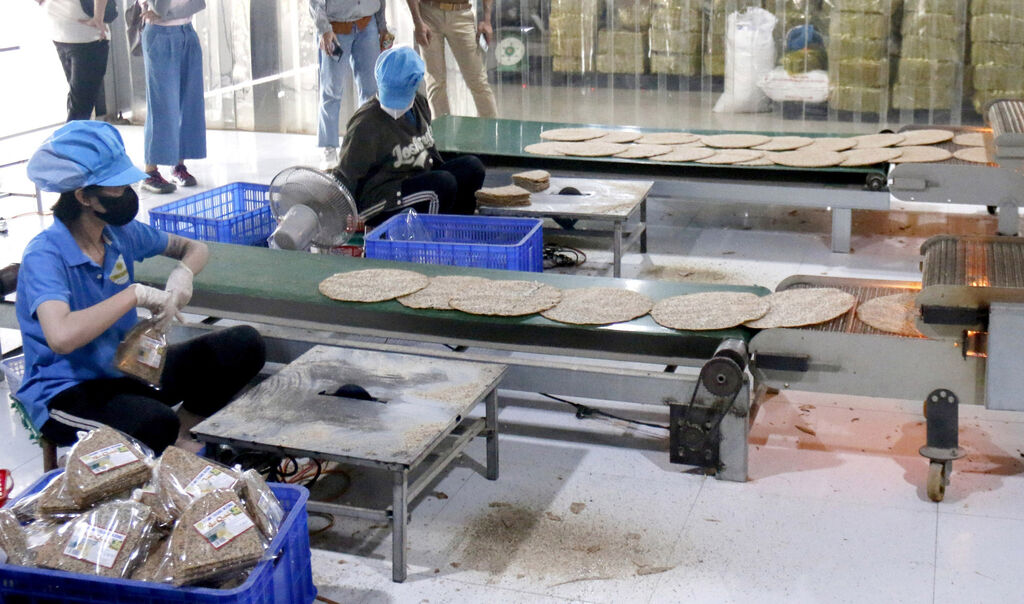 | Đóng gói bánh tráng tại một cơ sở đóng gói tại Làng bánh tráng Phú Long. |