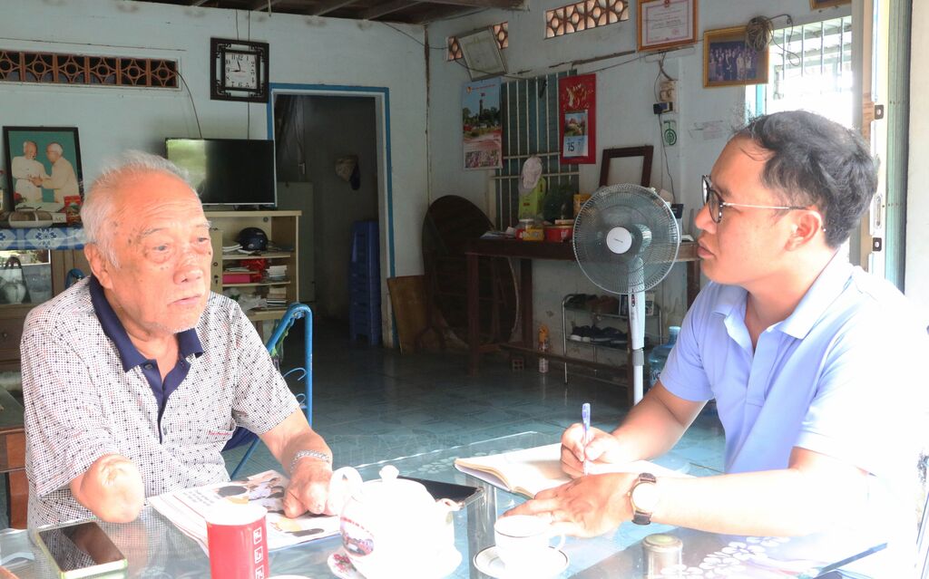 | Ông Hồ Minh Quang (sinh năm 1938), nguyên Trưởng ban Tuyên Giáo Huyện ủy Chợ Mới giai đoạn 1975-1987 trao đổi với phóng viên TTXVN. |