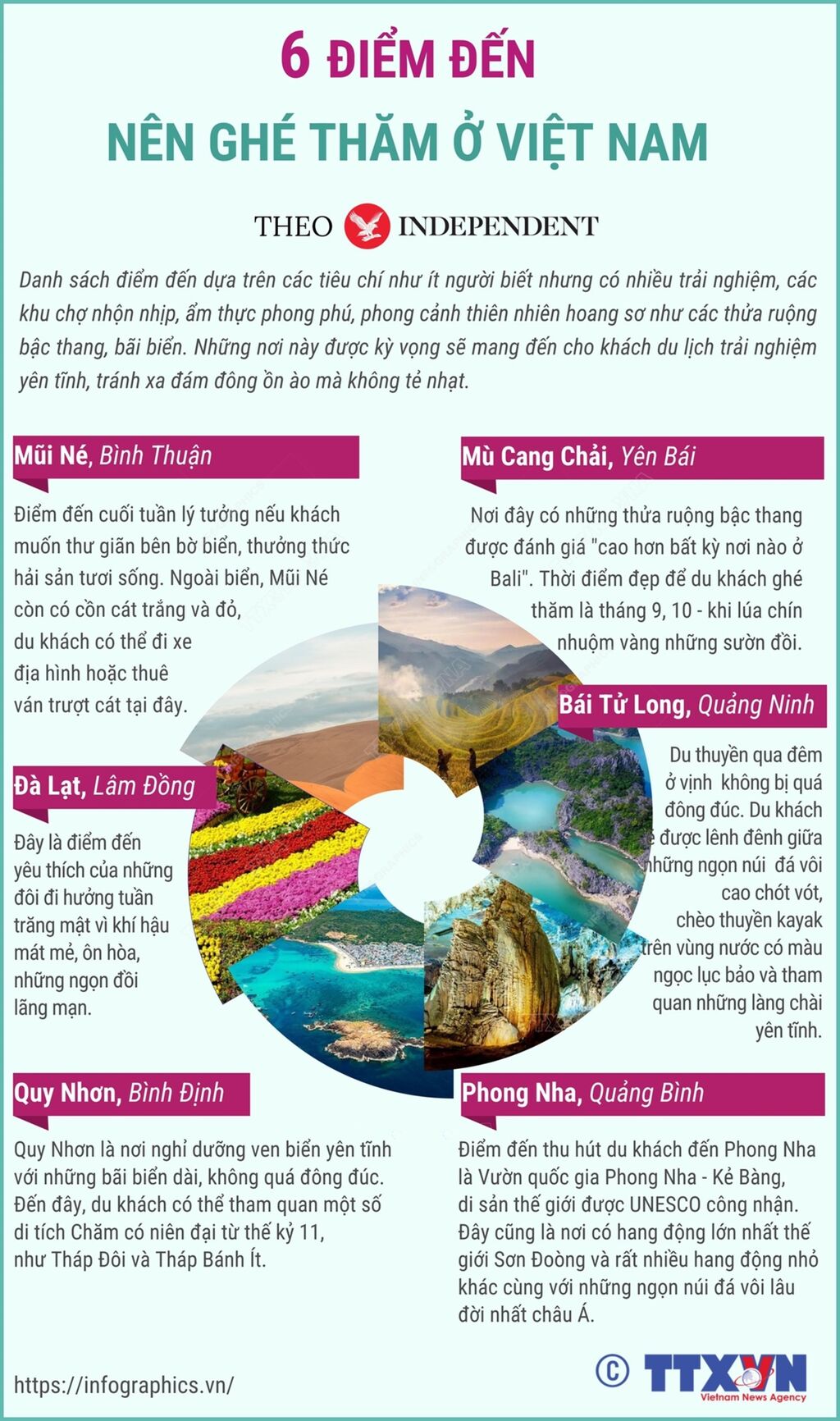Tờ Independent của Anh gợi ý 6 nơi khách quốc tế nhất định nên ghé thăm khi đến Việt Nam. Danh sách điểm đến dựa trên các tiêu chí như ít người biết nhưng có nhiều trải nghiệm, các khu chợ nhộn nhịp, ẩm thực phong phú, phong cảnh thiên nhiên hoang sơ như các thửa ruộng bậc thang, bãi biển. Những nơi này được kỳ vọng sẽ mang đến cho khách du lịch trải nghiệm yên tĩnh, tránh xa đám đông ồn ào mà không tẻ nhạt.