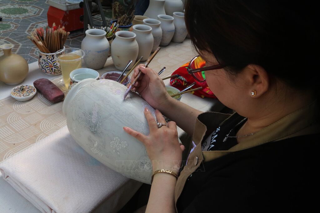 | Các nghệ nhân làm gốm ở Đồng Nai thực hiện vẽ màu lên bình gốm. |