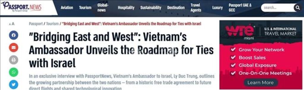 | Bài phỏng vấn Đại sứ Việt Nam tại Israel Lý Đức Trung của tạp chí PassportNews, đăng phát ngày 1/7. Ảnh: TTXVN phát |