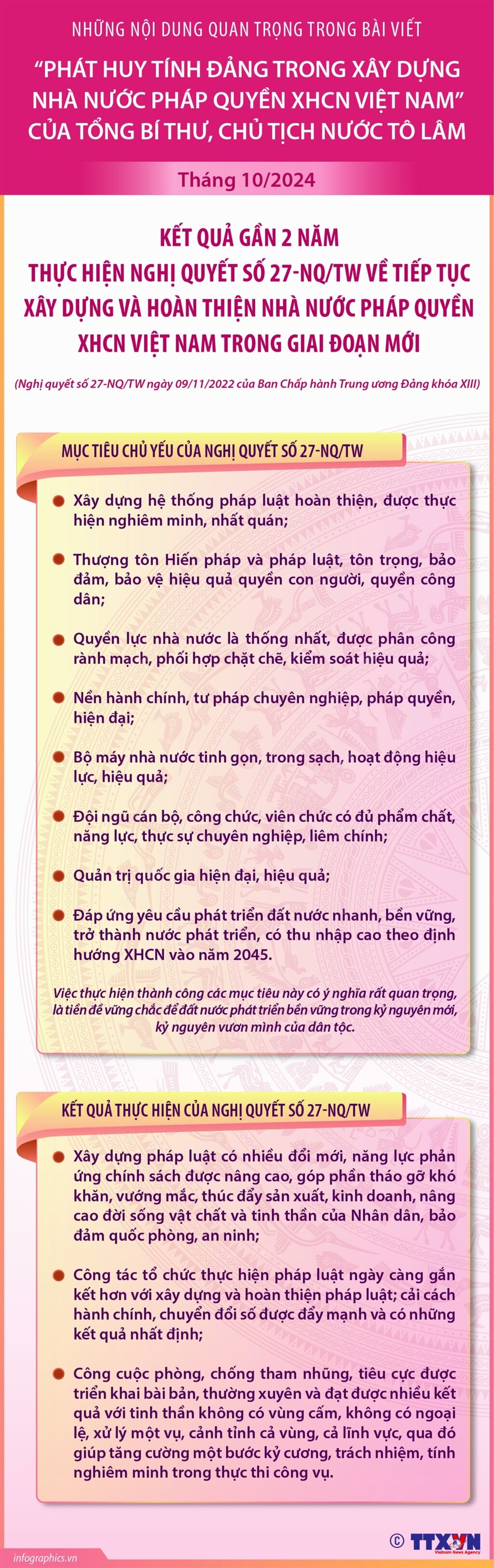 Trong bài viết “Phát huy tính Đảng trong xây dựng Nhà nước pháp quyền xã hội chủ nghĩa Việt Nam” viết tháng 10/2024, Tổng Bí thư, Chủ tịch nước Tô Lâm đã viết: Cùng với việc thực hiện công cuộc đổi mới, phát triển nền kinh tế thị trường định hướng XHCN , đất nước ta đã và đang từng bước xây dựng và hoàn thiện Nhà nước pháp quyền XHCN của Nhân dân, do Nhân dân, vì Nhân dân, dưới sự lãnh đạo của Đảng. Ngày 9/11/2022, Ban Chấp hành Trung ương Đảng khóa XIII ban hành Nghị quyết số 27-NQ/TW về tiếp tục xây dựng và hoàn thiện Nhà nước pháp quyền XHCN Việt Nam trong giai đoạn mới. Đây là lần đầu tiên Đảng ta ban hành một Nghị quyết chuyên đề về Nhà nước pháp quyền XHCN. Thực hiện Nghị quyết số 27-NQ/TW, trong gần 2 năm qua, chúng ta đã đạt được những kết quả đáng khích lệ. Trong đó, xây dựng pháp luật có nhiều đổi mới, năng lực phản ứng chính sách được nâng cao, góp phần tháo gỡ khó khăn, vướng mắc, thúc đẩy sản xuất, kinh doanh, nâng cao đời sống vật chất và tinh thần của Nhân dân, bảo đảm quốc phòng, an ninh...