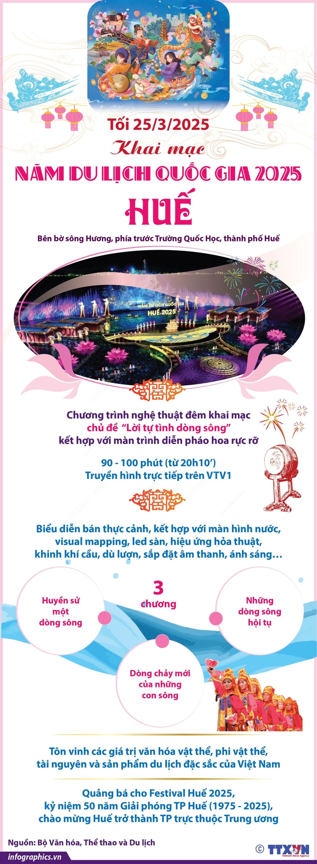 Hà Nội (TTXVN 25/3) Lễ khai mạc Năm Du lịch Quốc gia - Huế 2025 với chương trình nghệ thuật có chủ đề: “Lời tự tình dòng sông” cùng màn pháo hoa rực rỡ diễn ra vào tối ngày 25/3/2025 tại sân khấu bên bờ sông Hương, phía trước Trường Quốc Học, thành phố Huế. Năm Du lịch Quốc gia - Huế 2025 và Festival Huế 2025 là sự kiện văn hóa - kinh tế - xã hội và du lịch tiêu biểu quy mô quốc gia và tầm quốc tế gắn với kỷ niệm 50 năm giải phóng thành phố Huế (1975 - 2025) và các dịp lễ, kỷ niệm lớn khác của cả nước; hưởng ứng, chào mừng Huế trở thành thành phố trực thuộc Trung ương.