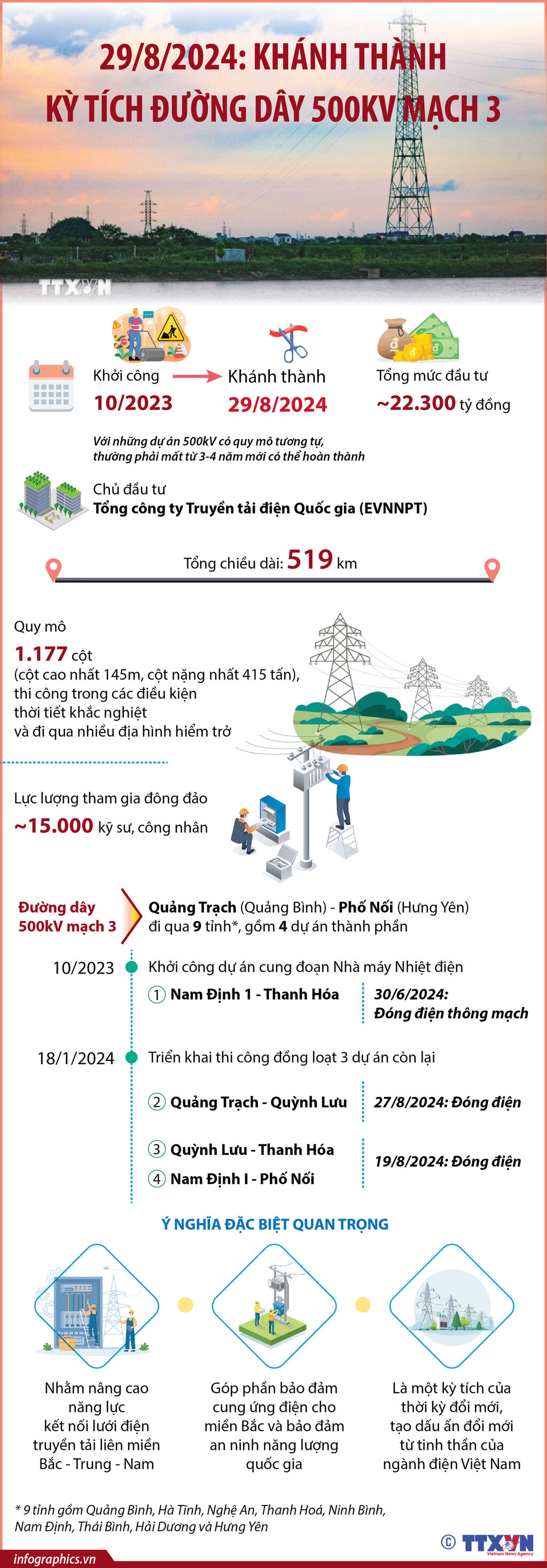 Ngày 29/8/2024, Tập đoàn Điện lực Việt Nam (EVN), Tổng công ty Truyền tải điện Quốc gia (EVNNPT) tổ chức Lễ khánh thành Dự án đường dây 500kV mạch 3 Quảng Trạch (Quảng Bình) đến Phố Nối (Hưng Yên). Nếu như đường dây 500kV Bắc - Nam mạch 1 đã nối liền dòng điện Bắc - Nam, đặt nền móng cho những bước phát triển lâu dài của ngành điện, thì Dự án đường dây 500kV mạch 3 là một Dự án đặc biệt, phát huy sức mạnh của cả hệ thống chính trị với khối lượng xây dựng khổng lồ, về đích với tiến độ thần tốc - đã tạo nên dấu ấn tinh thần mạch 3 và kỳ tích của ngành điện.