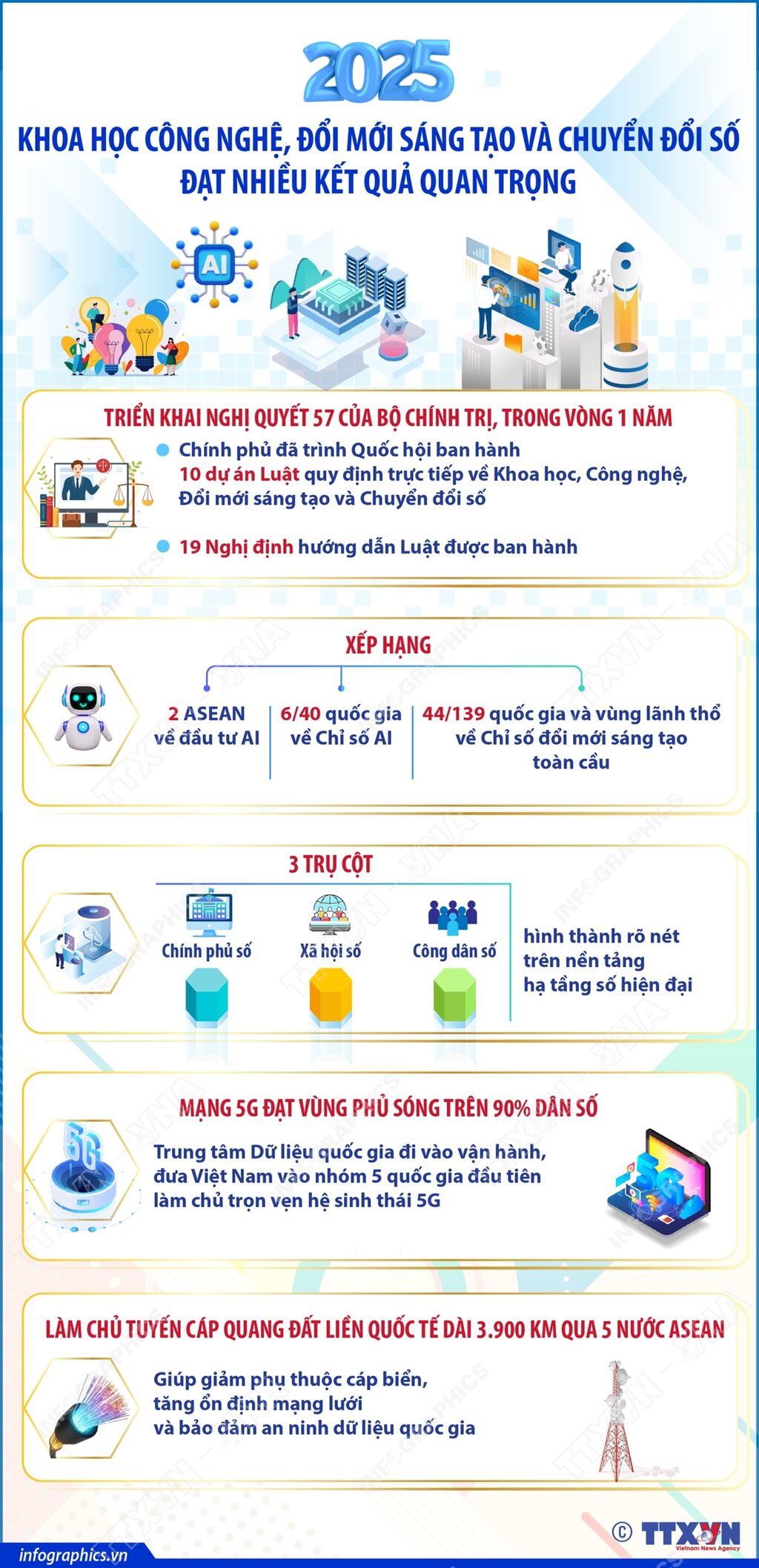 Nhiệm kỳ 2021-2025, đặc biệt là năm 2025, khoa học công nghệ, đổi mới sáng tạo và chuyển đổi số được triển khai quyết liệt, đạt kết quả bước đầu quan trọng. Triển khai Nghị quyết số 57 của Bộ Chính trị, trong vòng 1 năm, Chính phủ đã trình Quốc hội ban hành 10 dự án Luật quy định trực tiếp về Khoa học, Công nghệ, Đổi mới sáng tạo và Chuyển đổi số, 19 Nghị định hướng dẫn Luật được ban hành. Việt Nam vươn lên thứ 2 ASEAN về đầu tư AI, thứ 6/40 quốc gia về Chỉ số AI và thứ 44/139 về Chỉ số đổi mới sáng tạo toàn cầu. Ba trụ cột “Chính phủ số - Xã hội số - Công dân số” hình thành rõ nét trên nền tảng hạ tầng số hiện đại. Mạng 5G đạt vùng phủ sóng trên 90% dân số, Trung tâm Dữ liệu quốc gia đi vào vận hành, đưa Việt Nam vào nhóm 5 quốc gia đầu tiên làm chủ trọn vẹn hệ sinh thái 5G. Hạ tầng kết nối cũng ghi dấu mốc chiến lược với tuyến cáp quang đất liền quốc tế dài 3.900 km qua 5 nước ASEAN, do Việt Nam làm chủ, giúp giảm phụ thuộc cáp biển, tăng ổn định mạng lưới và bảo đảm an ninh dữ liệu quốc gia.