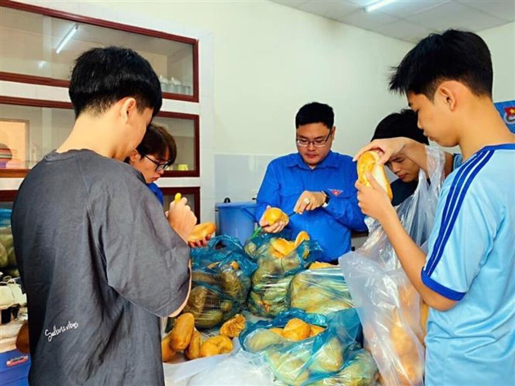 | Anh Lại Phước Trường Thành (giữa), Bí thư Đoàn phường Cái Khế, quận Ninh Kiều cùng các tình nguyện viên nấu cơm miễn phí cho bệnh nhân có hoàn cảnh khó khăn tại mô hình "Bếp ấm". |