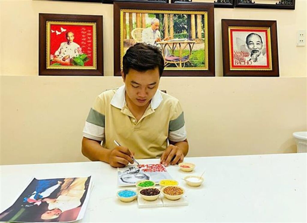 | Anh Khưu Tấn Bửu (sinh năm 1995), chủ mô hình khởi nghiệp tranh gạo Tấn Bửu hoàn thiện tác phẩm tranh gạo về Chủ tịch Hồ Chí Minh. |