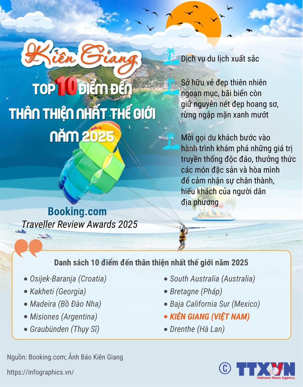 Tỉnh Kiên Giang (Việt Nam) đã được nền tảng du lịch trực tuyến hàng đầu Booking.com vinh danh là một trong “10 điểm đến thân thiện nhất thế giới” trong khuôn khổ giải thưởng Traveller Review Awards lần thứ 13. Kiên Giang góp mặt trong danh sách các địa danh thân thiện trên thế giới với dịch vụ du lịch xuất sắc.