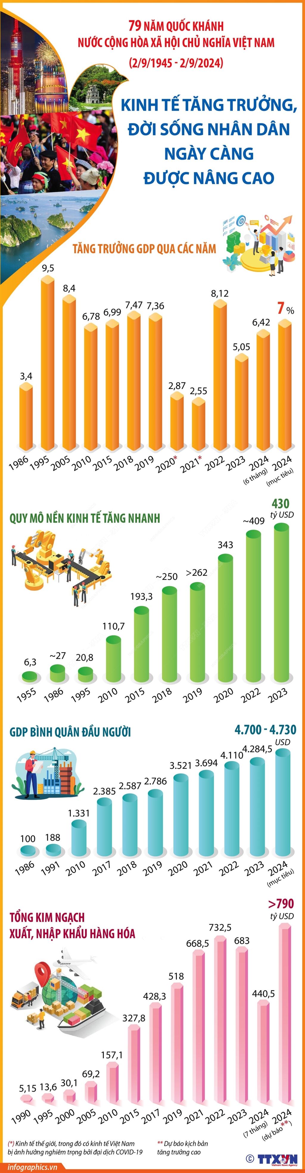 Sau 79 năm (2/9/1945-2/9/2024), từ một nền kinh tế nông nghiệp, lạc hậu, quy mô nhỏ bé, Việt Nam đã chuyển mình trở thành nền kinh tế đa dạng, có tỷ trọng công nghiệp, thương mại, dịch vụ ngày càng lớn và chuyển sang thời kỳ đẩy mạnh công nghiệp hóa, hiện đại hóa đất nước. Đặc biệt, sau gần 40 năm đổi mới, mở cửa và hội nhập (1986 đến nay), đất nước đã đạt được những thành tựu to lớn, có ý nghĩa lịch sử, phát triển mạnh mẽ và toàn diện. Quy mô, trình độ nền kinh tế được nâng lên. Đời sống nhân dân cả về vật chất và tinh thần được cải thiện rõ rệt. Năm 2023, quy mô GDP theo giá hiện hành ước đạt 430 tỷ USD; GDP bình quân đầu người theo giá hiện hành ước đạt 4.284,5 USD, tăng 160 USD so với năm 2022. Với kết quả đó, Việt Nam xếp thứ 34 theo bảng xếp hạng liên minh kinh tế thế giới (World Economic League Table - WELT) của Trung tâm dự báo, phân tích kinh tế độc lập của Anh (CEBR). Dự báo trong tương lai, thứ hạng quy mô kinh tế của Việt Nam có thể tăng nhanh, đạt vị trí 24 vào năm 2033, với quy mô kinh tế đạt 1.050 tỷ USD.