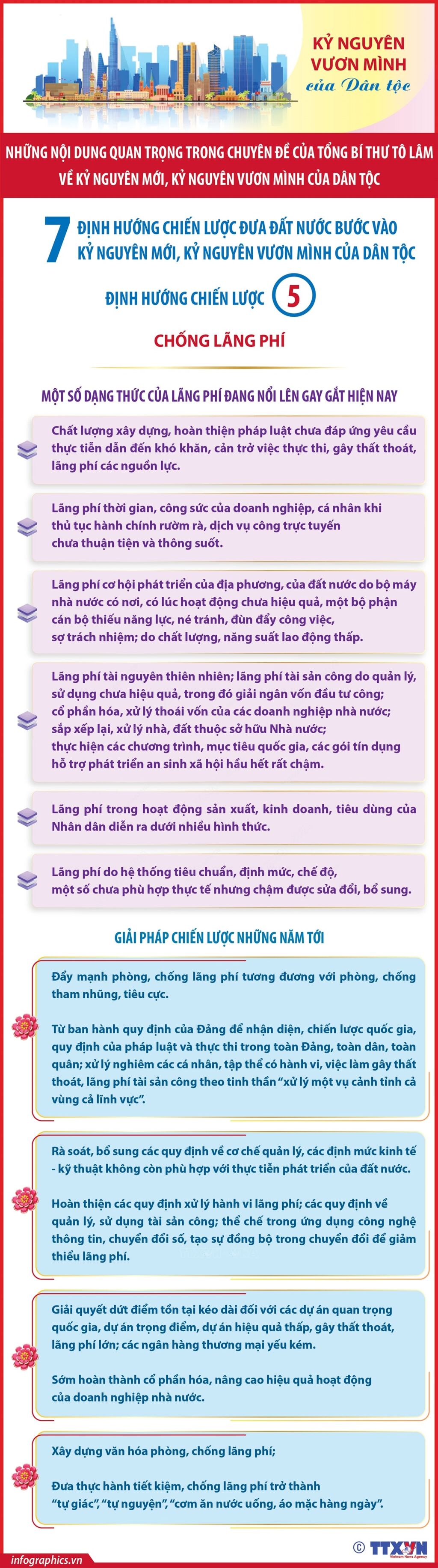 Trong chuyên đề về kỷ nguyên mới, kỷ nguyên vươn mình của dân tộc ngày 31/10/2024, Tổng Bí thư Tô Lâm đã trao đổi về 7 định hướng chiến lược đưa đất nước bước vào kỷ nguyên mới, kỷ nguyên vươn mình của dân tộc, trong đó có định hướng Chống lãng phí. Tổng Bí thư đề ra các giải pháp chiến lược những năm tới đó là: Đẩy mạnh phòng, chống lãng phí tương đương với phòng, chống tham nhũng, tiêu cực. Từ ban hành quy định của Đảng để nhận diện, chiến lược quốc gia, quy định của pháp luật và thực thi trong toàn Đảng, toàn dân, toàn quân; xử lý nghiêm các cá nhân, tập thể có hành vi, việc làm gây thất thoát, lãng phí tài sản công theo tinh thần “xử lý một vụ cảnh tỉnh cả vùng cả lĩnh vực”. Rà soát, bổ sung các quy định về cơ chế quản lý, các định mức kinh tế - kỹ thuật không còn phù hợp với thực tiễn phát triển của đất nước. Hoàn thiện các quy định xử lý hành vi lãng phí; các quy định về quản lý, sử dụng tài sản công; thể chế trong ứng dụng công nghệ thông tin, chuyển đổi số, tạo sự đồng bộ trong chuyển đổi để giảm thiểu lãng phí…