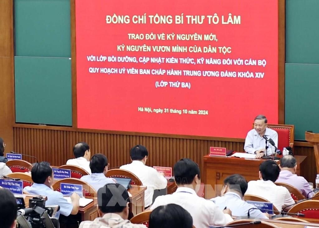 | Tổng Bí thư Tô Lâm trao đổi với các học viên cán bộ quy hoạch Ủy viên Trung ương Đảng khoá 14 về kỷ nguyên mới, kỷ nguyên vươn mình của dân tộc chiều 31/10/2024, tại Học viện Chính trị Quốc gia Hồ Chí Minh. Ảnh: Thống Nhất – TTXVN |
