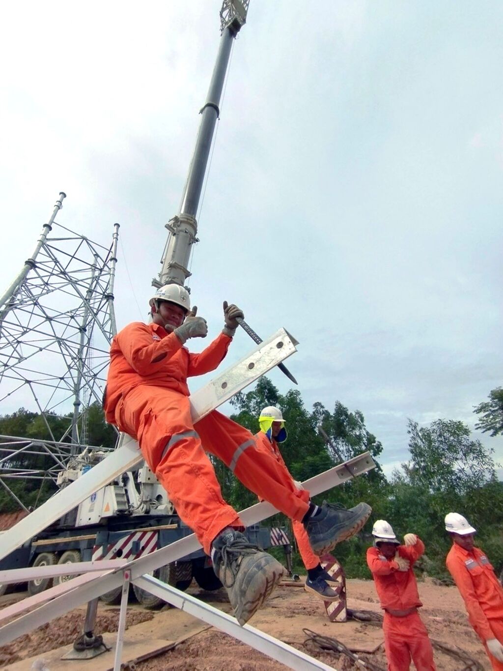 | Kỹ sư Nguyễn Hoàng Thắng (trái), tham gia Đội xung kích hỗ trợ thi công xây dựng dự án trọng điểm quốc gia Đường dây 500kV Mạch 3, từ Quảng Trạch đến Phố Nối. |