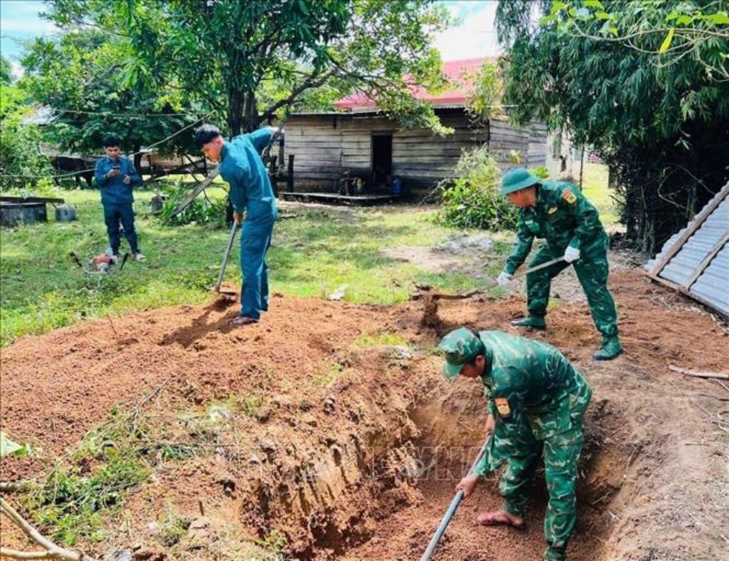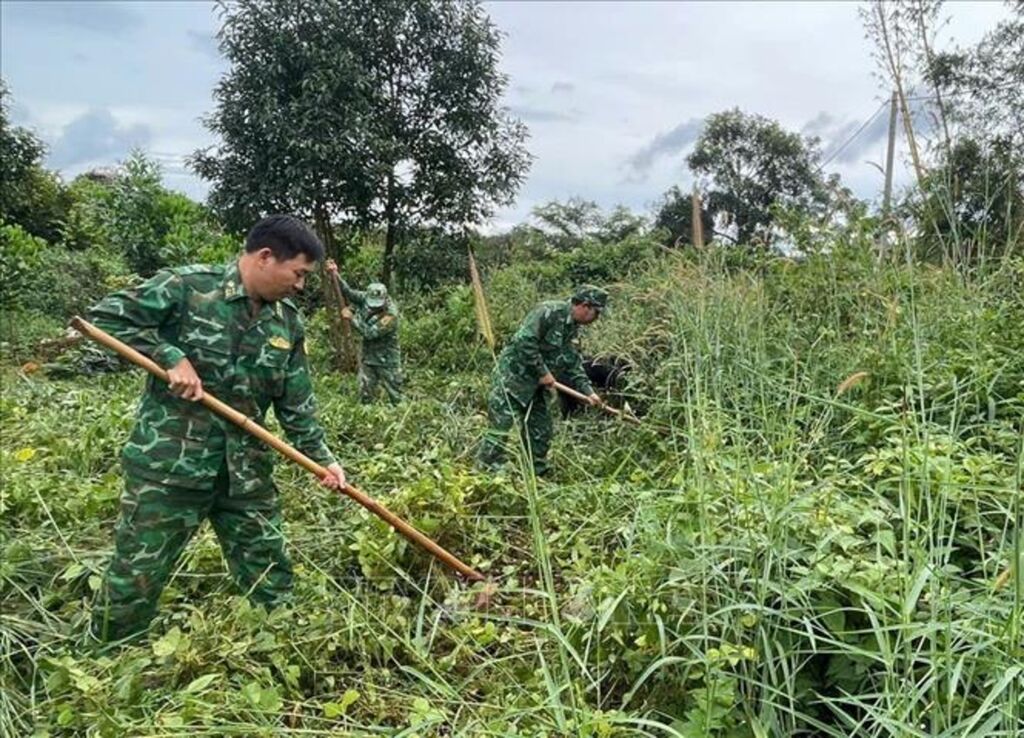 | Cán bộ, chiến sĩ Đồn Biên phòng Ia Mơ phối hợp với chính quyền xã giúp dân đào mương nước để sản xuất lúa 2 vụ. |