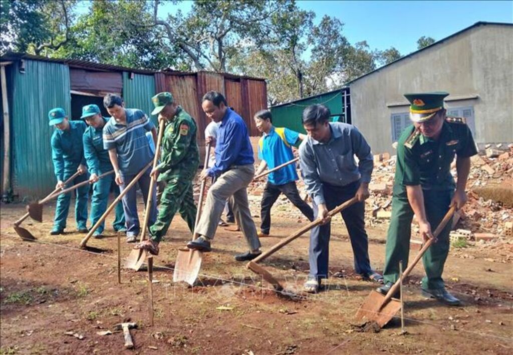 | Cán bộ, chiến sĩ Đồn Biên phòng Ia Chía và chính quyền địa phương, thôn xóm giúp gia đình chị Rơ Lan H’Líu dựng nhà mới sau khi căn nhà tạm của chị bị hư hại do mưa bão. |