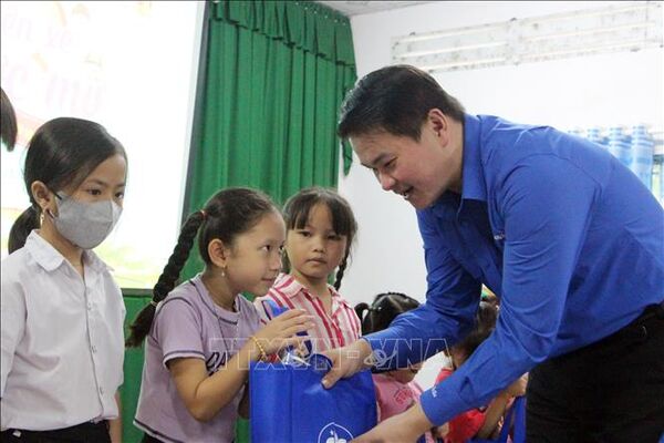 | Ban Tổ chức tặng quà cho các thiếu nhi tiêu biểu tham dự diễn đàn. |