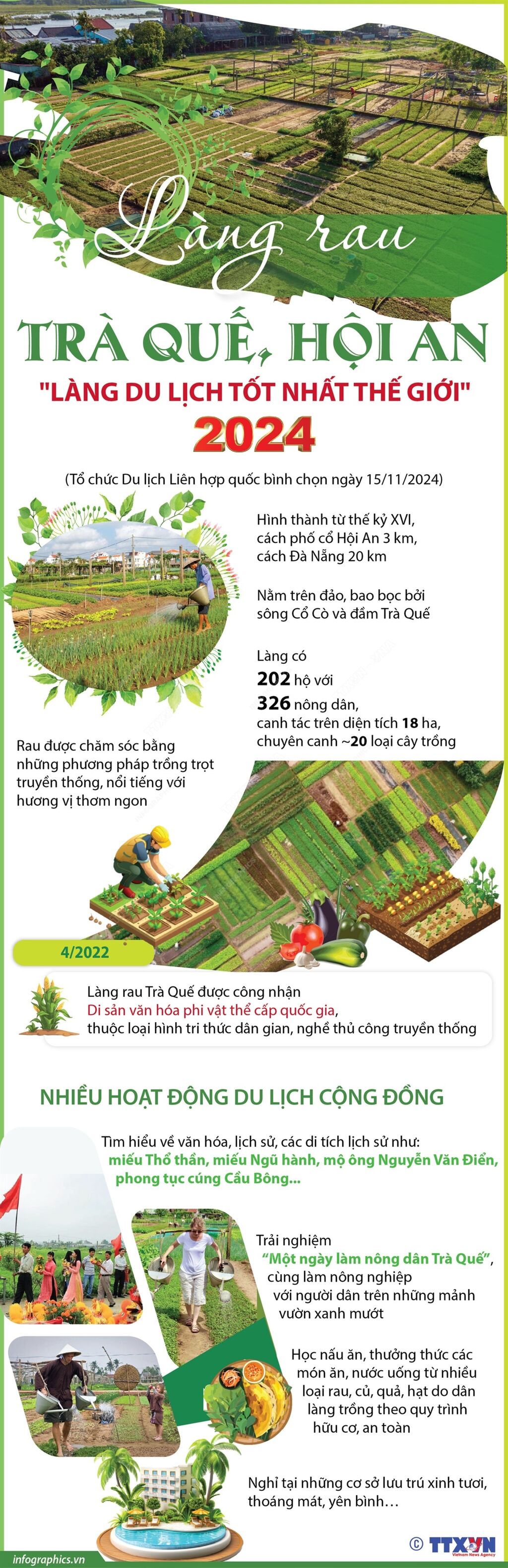 Làng rau Trà Quế đã trở thành đại diện duy nhất của Việt Nam lọt vào danh sách 55 "Làng du lịch tốt nhất thế giới" năm 2024 do Tổ chức Du lịch Liên hợp quốc bình chọn.
