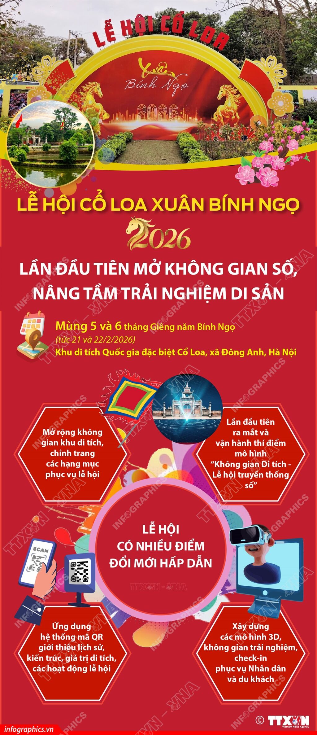 Lễ hội Cổ Loa Xuân Bính Ngọ năm 2026 diễn ra trong hai ngày 21 và 22/2/2026 (tức ngày 5 và 6 tháng Giêng năm Bính Ngọ) tại Khu di tích Quốc gia đặc biệt Cổ Loa (Hà Nội), với các nghi thức tế lễ truyền thống của Bát xã Loa Thành cùng nhiều hoạt động văn hóa dân gian, văn nghệ và thi đấu thể thao. Năm nay, lễ hội có nhiều điểm đổi mới hấp dẫn. Bên cạnh việc mở rộng không gian khu di tích, chỉnh trang các hạng mục phục vụ lễ hội, xã Đông Anh lần đầu tiên thiết kế và đưa vào vận hành một không gian số hóa độc đáo, tạo thêm trải nghiệm mới mẻ cho người dân và du khách.