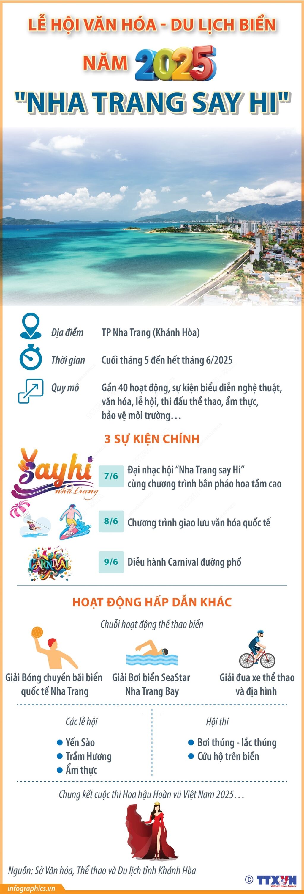 Lễ hội Văn hóa - Du lịch biển năm 2025 với chủ đề "Nha Trang say Hi" được diễn ra xuyên suốt từ cuối tháng 5 đến hết tháng 6 năm 2025. Trong đó, thời gian cao điểm diễn ra các sự kiện từ ngày 7 đến 9/6/2025, gồm có 3 sự kiện chính: Đại nhạc hội “Nha Trang say Hi”; chương trình giao lưu văn hóa quốc tế và diễu hành Carnival. Với các hoạt động, sự kiện đặc sắc, đa dạng và cuốn hút, chương trình Lễ hội Văn hóa - Du lịch biển năm 2025 hứa hẹn mang đến cho người dân, du khách những hoạt động, sự kiện sôi động và hấp dẫn.
