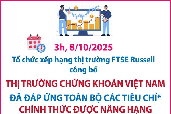 Ủy ban Chứng khoán Nhà nước cho biết, ngày 8/10/2025 (vào lúc 3 giờ 00 phút theo giờ Hà Nội), tổ chức xếp hạng thị trường FTSE Russell công bố thị trường chứng khoán Việt Nam đã đáp ứng toàn bộ các tiêu chí chính thức và được nâng hạng từ thị trường cận biên lên thị trường mới nổi thứ cấp.