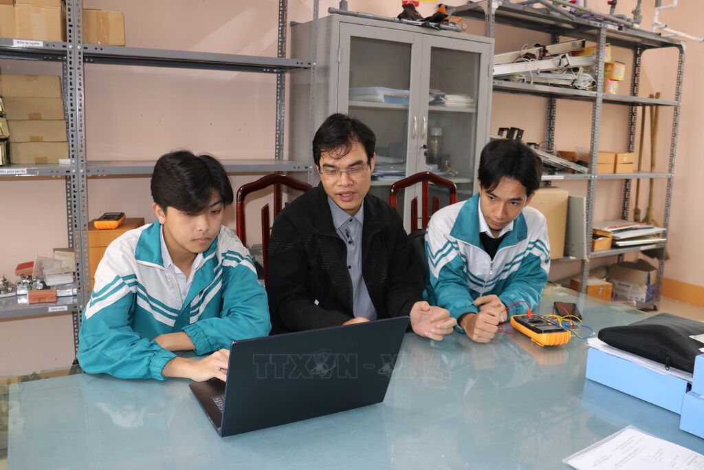 | Lê Minh Hiếu (ngoài cùng bên phải) luôn nỗ lực trau dồi kiến thức, tích cực tham gia các cuộc thi khoa học kỹ thuật. |