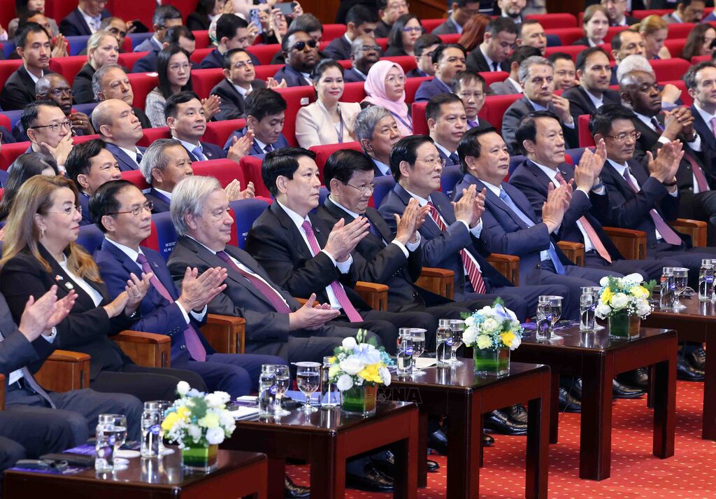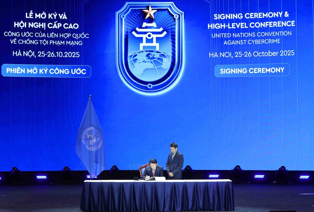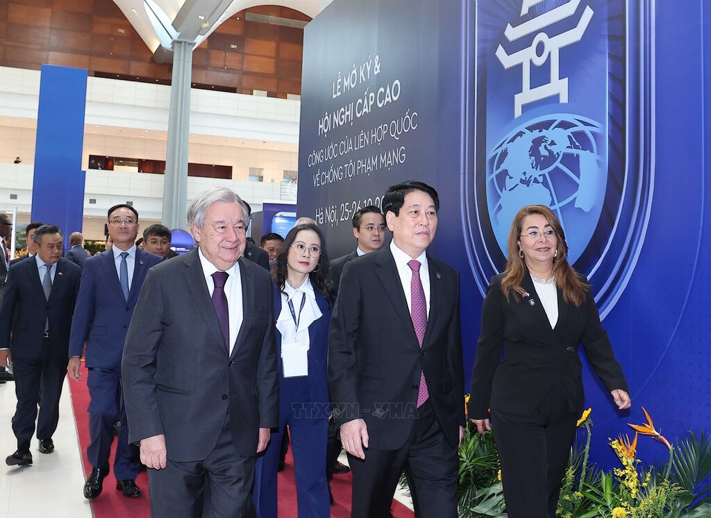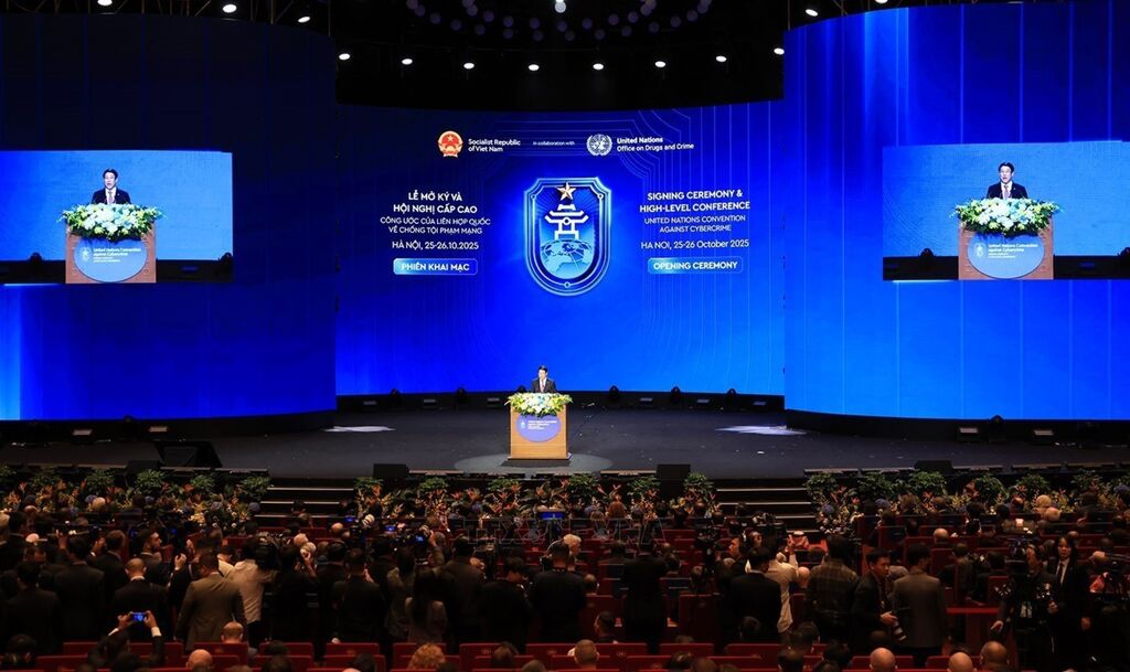 Sáng 25/10/2025, Lễ mở ký và Hội nghị cấp cao Công ước của Liên hợp quốc về chống tội phạm mạng (Công ước Hà Nội) với chủ đề “Chống tội phạm mạng, chia sẻ trách nhiệm, hướng tới tương lai” khai mạc trọng thể tại Trung tâm Hội nghị Quốc gia (Hà Nội) dưới sự đồng chủ trì của Chủ tịch nước Lương Cường và Tổng Thư ký Liên hợp quốc António Guterres. Ảnh: TTXVN