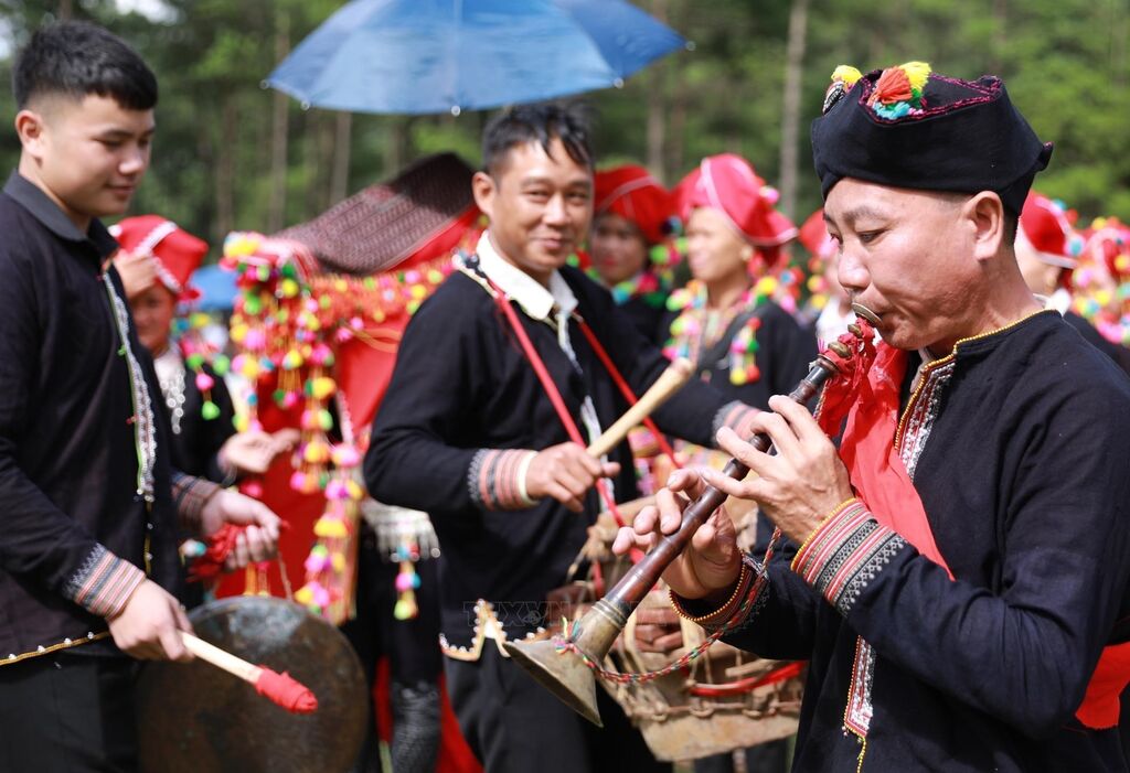 Lễ rước dâu là một nghi thức quan trọng trong lễ cưới của đồng bào Dao đỏ ở bản Nậm Sáng, xã Mường Than, tỉnh Lai Châu. Trải qua thời gian cùng những thăng trầm của lịch sử, đến nay, người Dao đỏ nơi đây vẫn giữ được nghi thức truyền thống mang đậm bản sắc dân tộc. Cô dâu mặc trang phục truyền thống rực rỡ sắc màu. Đoàn đón dâu nhà trai phải chuẩn bị một đội kèn trống gồm 4 người, đây là phần không thể thiếu trong nghi lễ đón dâu. Tiếng kèn, trống, chiêng, chũm chọe để chào mừng và thông báo cho tổ tiên, đất trời về sự kiện trọng đại này. Ảnh: Quý Trung – TTXVN