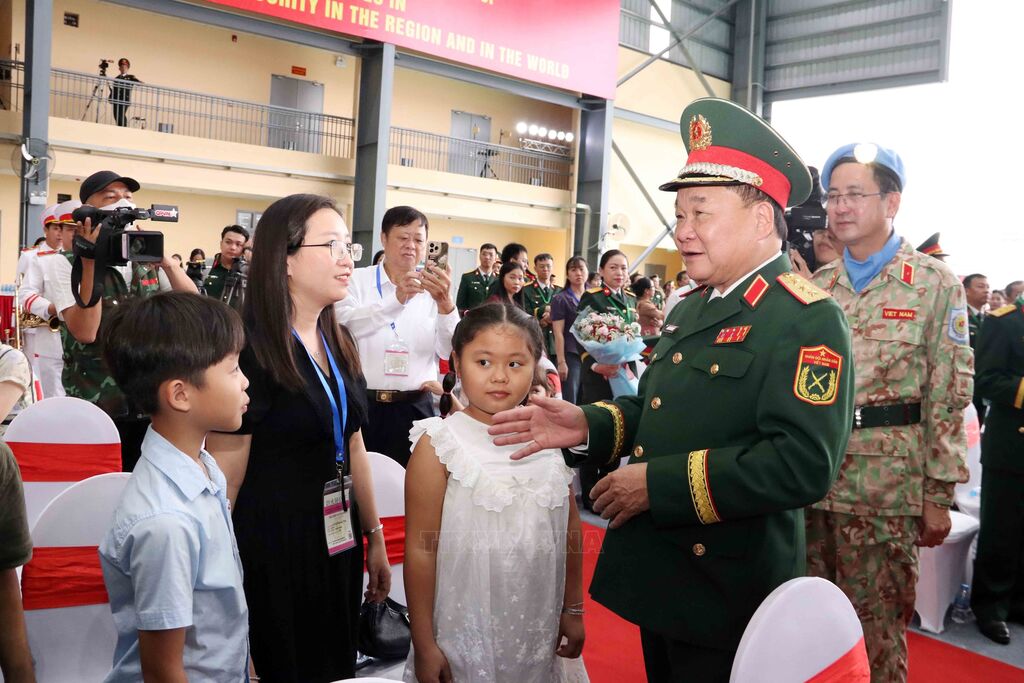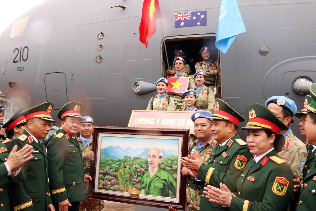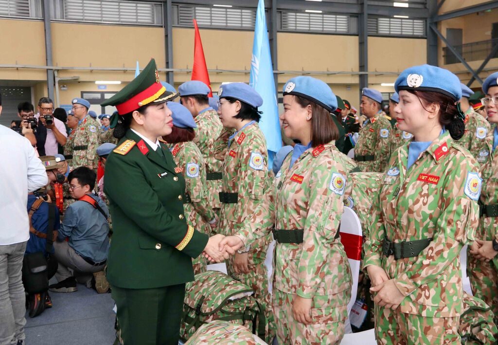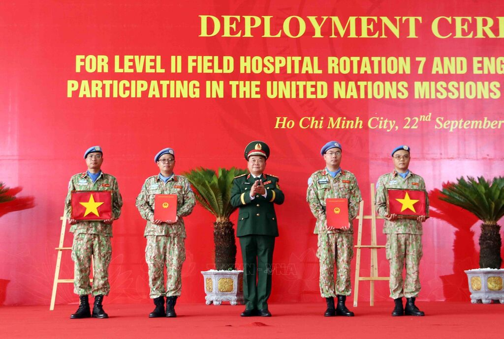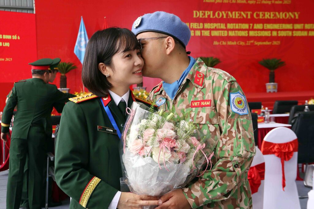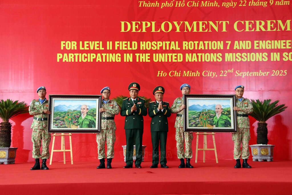 Ngày 22/9/2025, tại sân bay quốc tế Tân Sơn Nhất, Thành phố Hồ Chí Minh, Bộ Quốc phòng tổ chức Lễ xuất quân Bệnh viện dã chiến cấp 2 số 7 và Đội Công binh số 4 lên đường thực hiện nhiệm vụ gìn giữ hòa bình của Liên hợp quốc tại Phái bộ gìn giữ hòa bình của Liên hợp quốc tại Nam Xu-đăng (Phái bộ UNMISS) và Khu vực Abyei (Phái bộ UNISFA). Ảnh: Xuân Khu-TTXVN