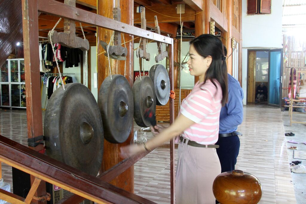 | Khách du lịch trải nghiệm không gian cồng chiêng tại homestay Bích Trang, bản Hoa Tiến, xã Châu Tiến, huyện Quỳ Châu (Nghệ An). |