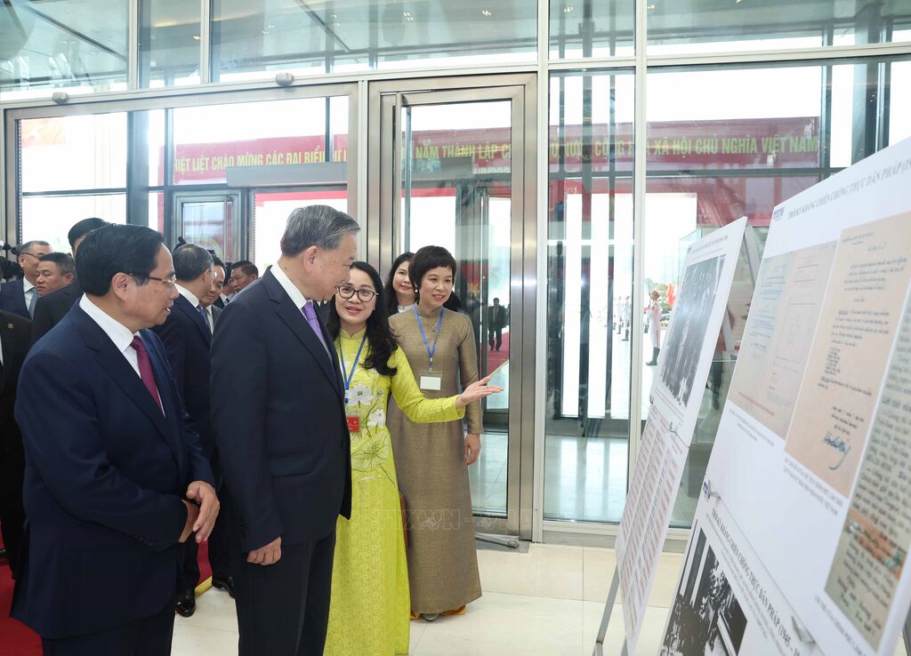 | Tổng Bí thư Tô Lâm và Thủ tướng Phạm Minh Chính cùng các đại biểu tham quan trưng bày ảnh với chủ đề "Dưới ngọn cờ Đảng, 80 năm Chính phủ phụng sự Tổ quốc, phục vụ Nhân dân" do TTXVN thực hiện. |