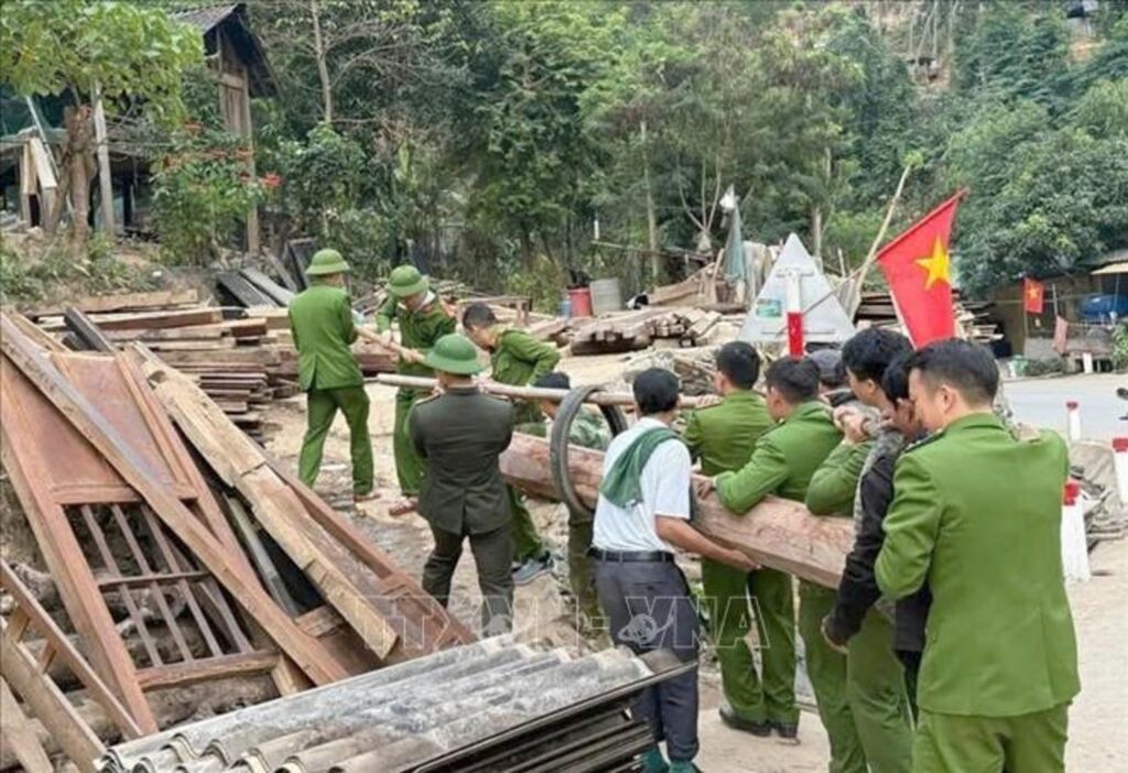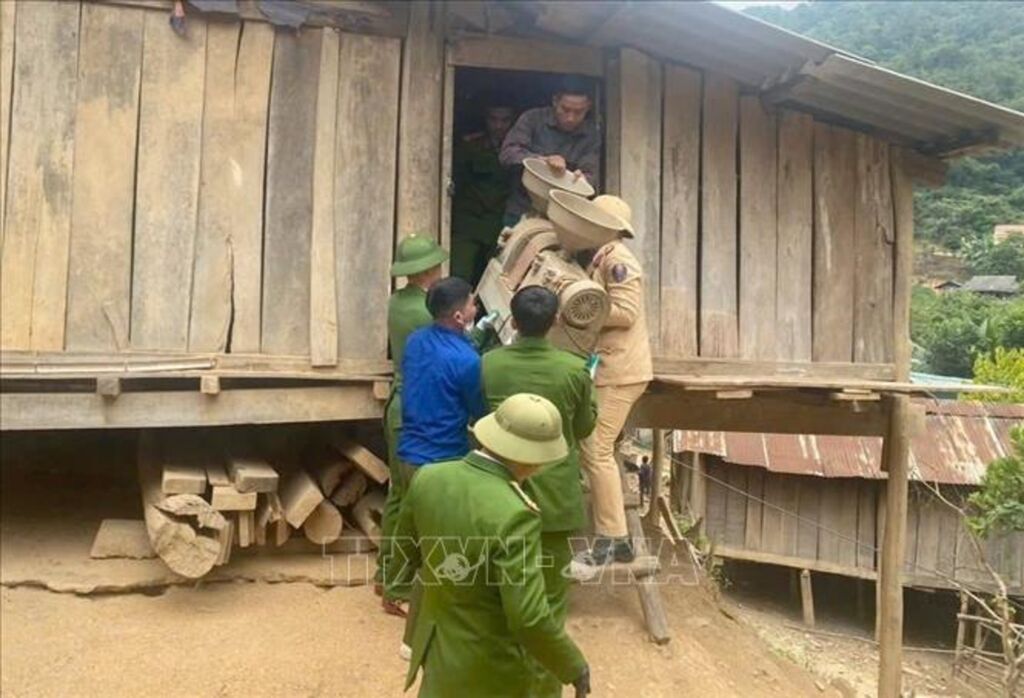 | Lực lượng Công an huyện Kỳ Sơn (Nghệ An) huy động 40 cán bộ, chiến sĩ giúp người dân bản Vàng Phao tháo dỡ nhà cửa, di chuyển dồ đạc, vật dụng đến Khu tái định cư mới. |