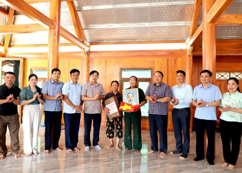 | Chủ tịch UBND tỉnh Hà Giang Phan Huy Ngọc và các đại biểu động viên, tặng quà và chúc mừng gia đình bà Hoàng Thị Tô ở xã Đông Thành, huyện Bắc Quang, khánh thành ngôi nhà mới. |