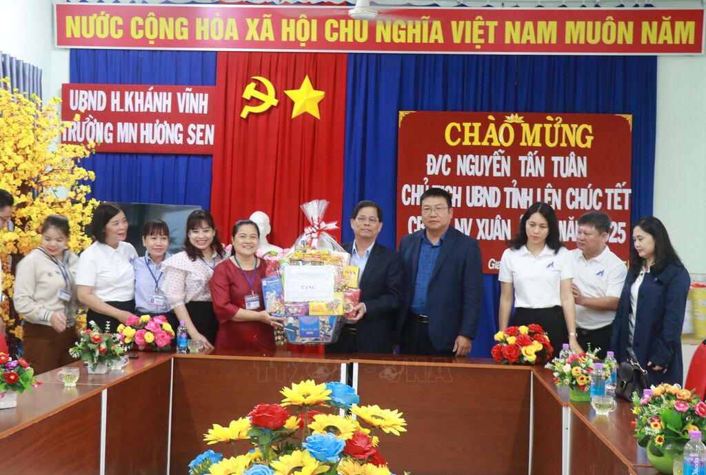 | Chủ tịch UBND tỉnh Khánh Hòa Nguyễn Tấn Tuân cùng đoàn công tác tặng quà tết cho Trường mần non xã Giang Ly, huyện Khánh Sơn. |