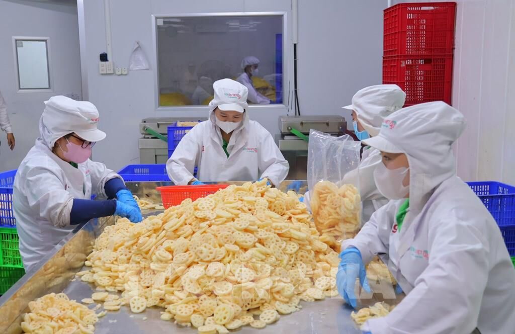 | Công nhân sơ chế củ sen tại Nhà máy của Công ty Cổ phần thực phẩm Sen Đại Việt (huyện Tháp Mười). |