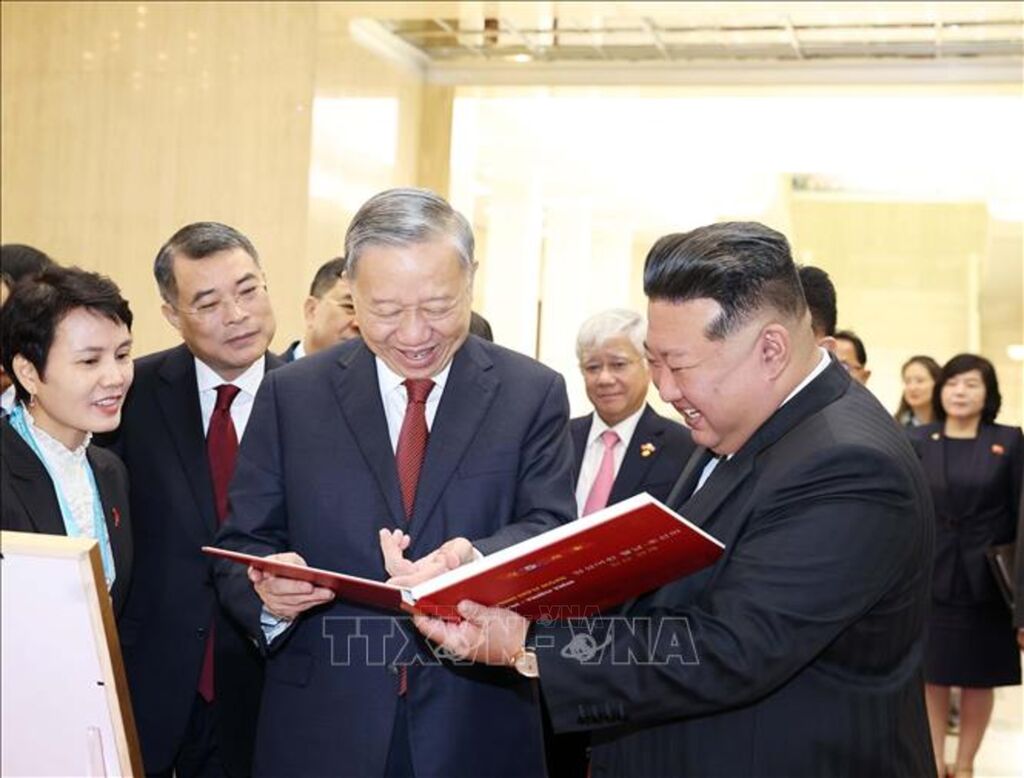 | Sau khi kết thúc hội đàm, Tổng Bí thư Tô Lâm trao tặng Tổng Bí thư, Chủ tịch Quốc vụ CHDCND Triều Tiên Kim Jong Un cuốn sách ảnh "Thắm tình hữu nghị Việt Nam - Triều Tiên". Ảnh: Thống Nhất – TTXVN |