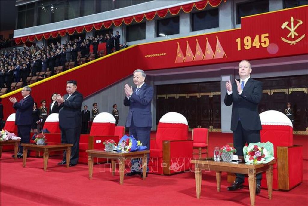 | (Từ trái qua): Thủ tướng Trung Quốc Lý Cường; Tổng Bí thư, Chủ tịch Quốc vụ Triều Tiên Kim Jong Un; Tổng Bí thư Tô Lâm và Chủ tịch Đảng nước Nga Thống nhất, Phó Chủ tịch Hội đồng an ninh Liên bang Nga Dmitry Medvedev tham dự Chương trình. Ảnh: Thống Nhất – TTXVN |