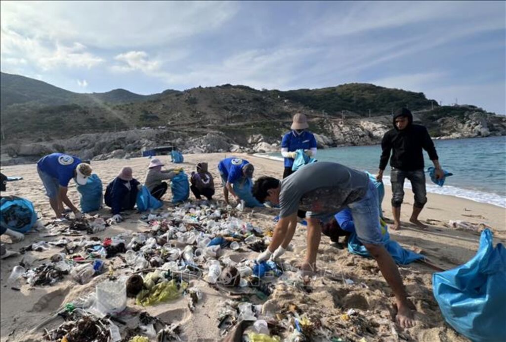 | Tình nguyện viên tham gia dọn rác, làm sạch bãi biển trên địa bàn huyện Ninh Hải. |