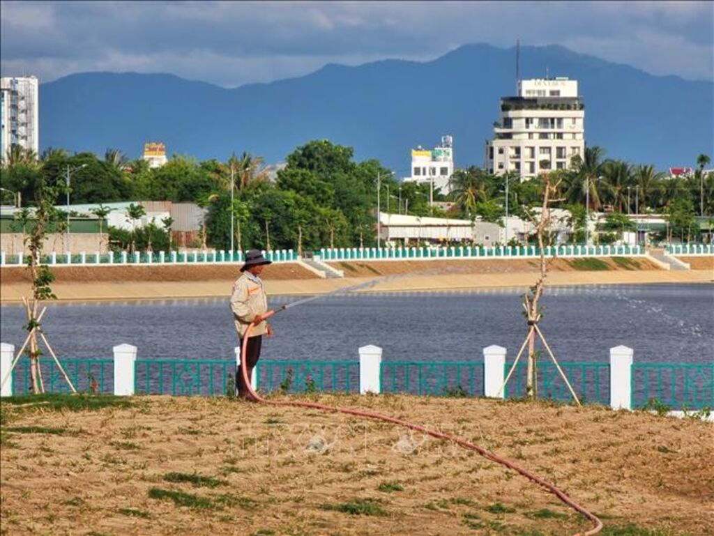 | Công nhân chăm sóc cây xanh tại khu vực Hồ điều hòa trung tâm (phường Mỹ Bình, thành phố Phan Rang – Tháp Chàm). |